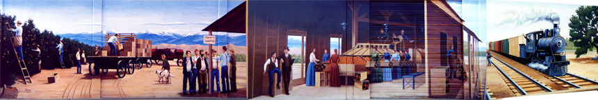 The oranges were packed in an open shed, not an enclosed building. The right end of the mural winds around the corner, and a Southern Pacific Train is shown along with the tramps enjoying a respite under an Oak tree. There was no refrigeration at the time, and almost all oranges were shipped by rail. You will notice a man is pedaling a bicycle-like apparatus which turns a “bull-wheel” that moves a belt that carries the oranges to an automatic sizer and into bins. There was no electrical power, just true man power. The actual placing of the oranges in wooden crates was for the most part a woman’s job. The days were long, twelve hours or more as everyone hurried to get the oranges off the trees, packed in boxes, loaded into the boxcar and on their way to market before frost or decay damaged them. Local historians agree the first oranges were picked in 1893 and then packed by Capt. Hutchinson in the old McNeir grain warehouse. The warehouse was located on the west side of the Southern Pacific tracks just south of Honolulu Street. The mural is symbolic of all the packing sheds that sprang up at the beginning of the twentieth century. It is not a depiction of any one packing shed, but a composite of several. It is not the story of a building, but the proud story of the people whose sweat and ingenuity made it all happen. The mural is 14' in height by 100' in width. |