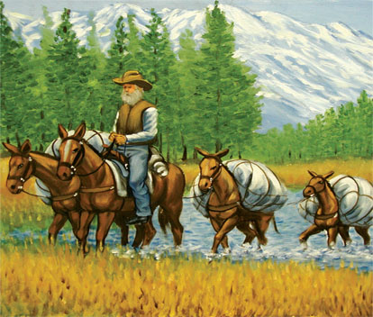 The High Sierra Pack Trip depicts a typical old timer traveling through the Sierra mountain range which begins at the east side of Lindsay. The mural is 8 feet high by 8 feet in length. |